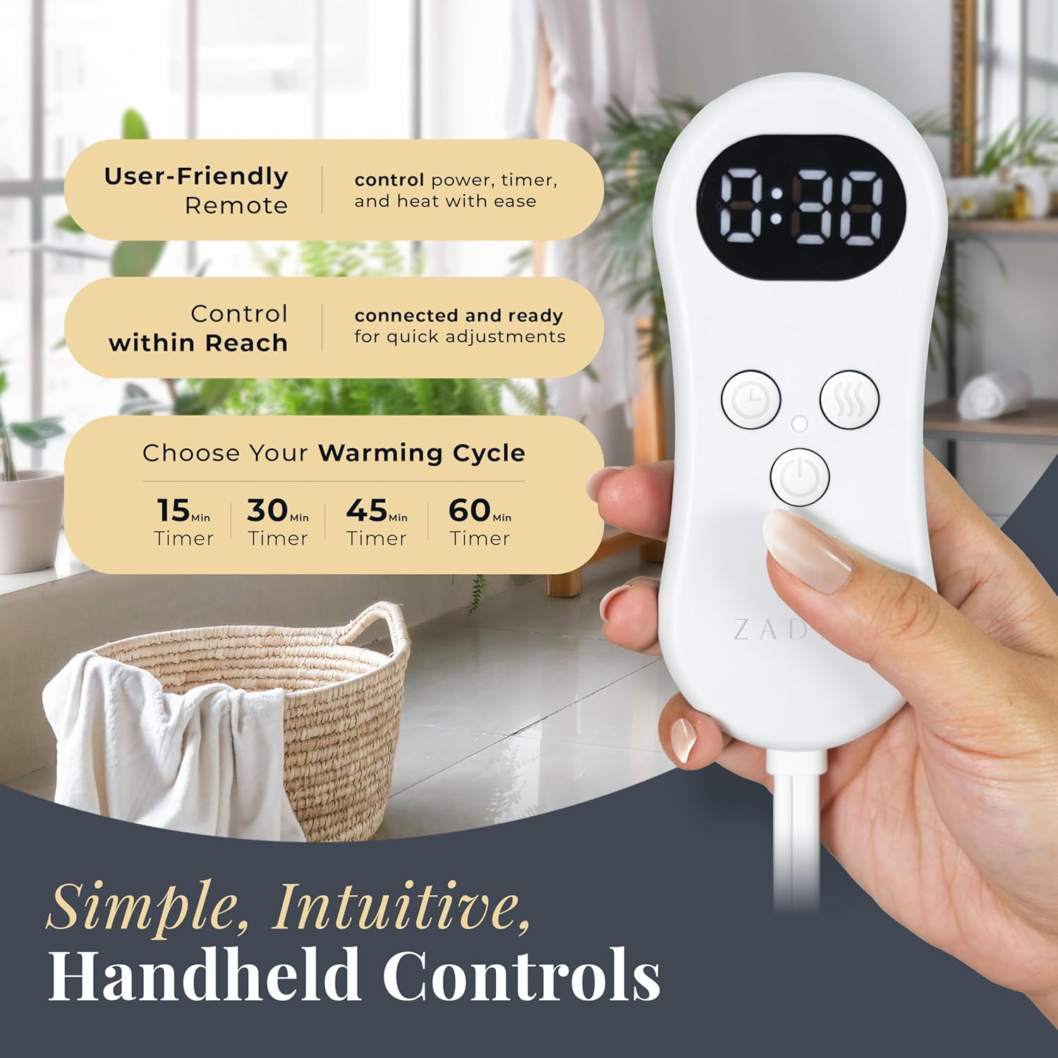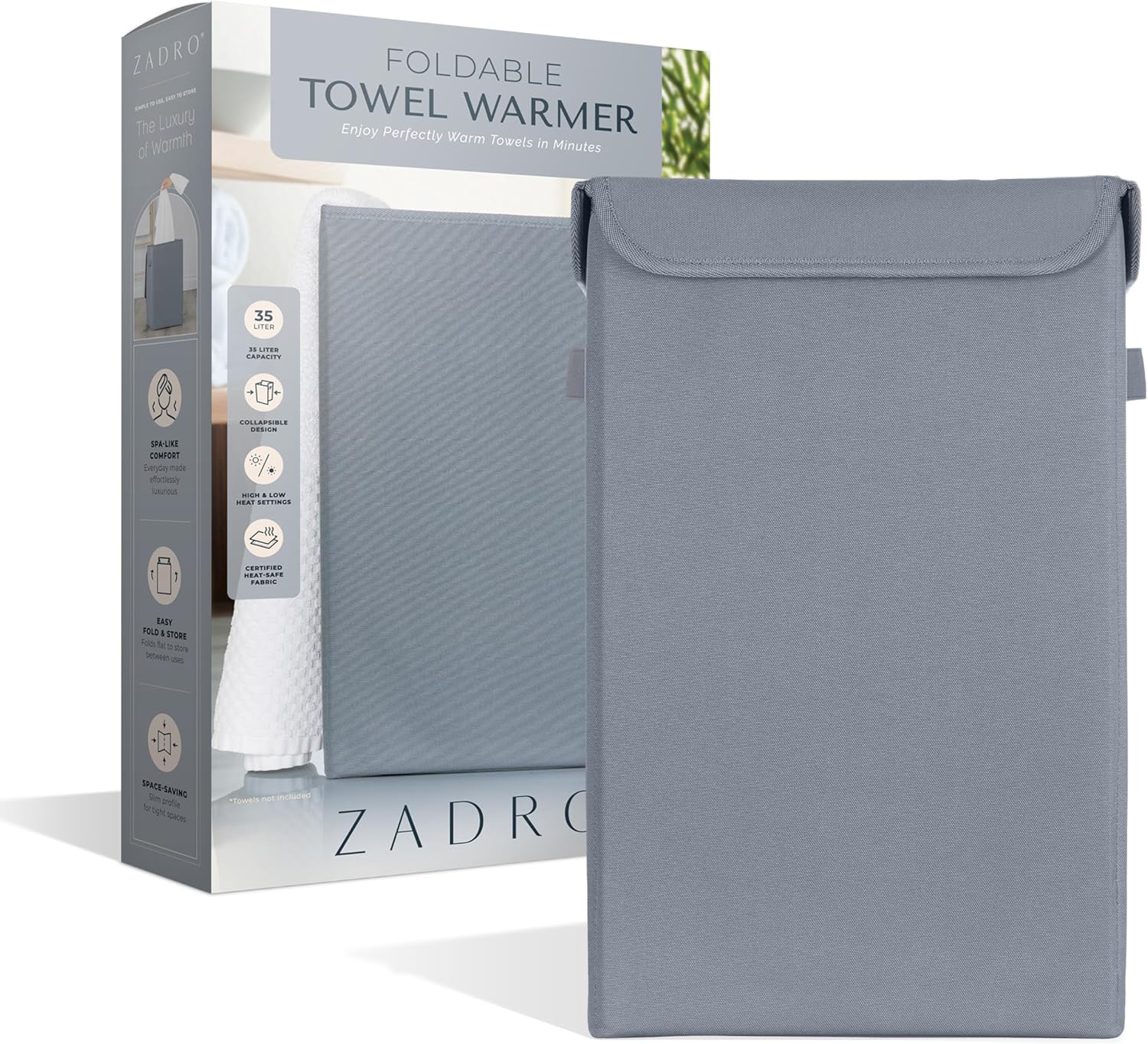 Enjoy perfectly warm towels in just minutes! The generous 9.2 Gallon / 35 Liter chamber comfortably warms two bath sheets or four towels, plus robes or a throw, with even surround heat. The soft-sided, structured body is wrapped in certified heat safe fabric for reliable performance and a calm touch. It delivers cozy results, and folds flat to keep your space serene and uncluttered. Choose High or Low warmth and set a 15, 30, 45 or 60 minute timer with automatic shut-off for effortless safety. A sleek remote keeps control simple and easy, while the lightweight foldable design moves easily from bathroom to bedroom to guest suite. Minimal footprint, maximum comfort. Your everyday ritual, beautifully refined.