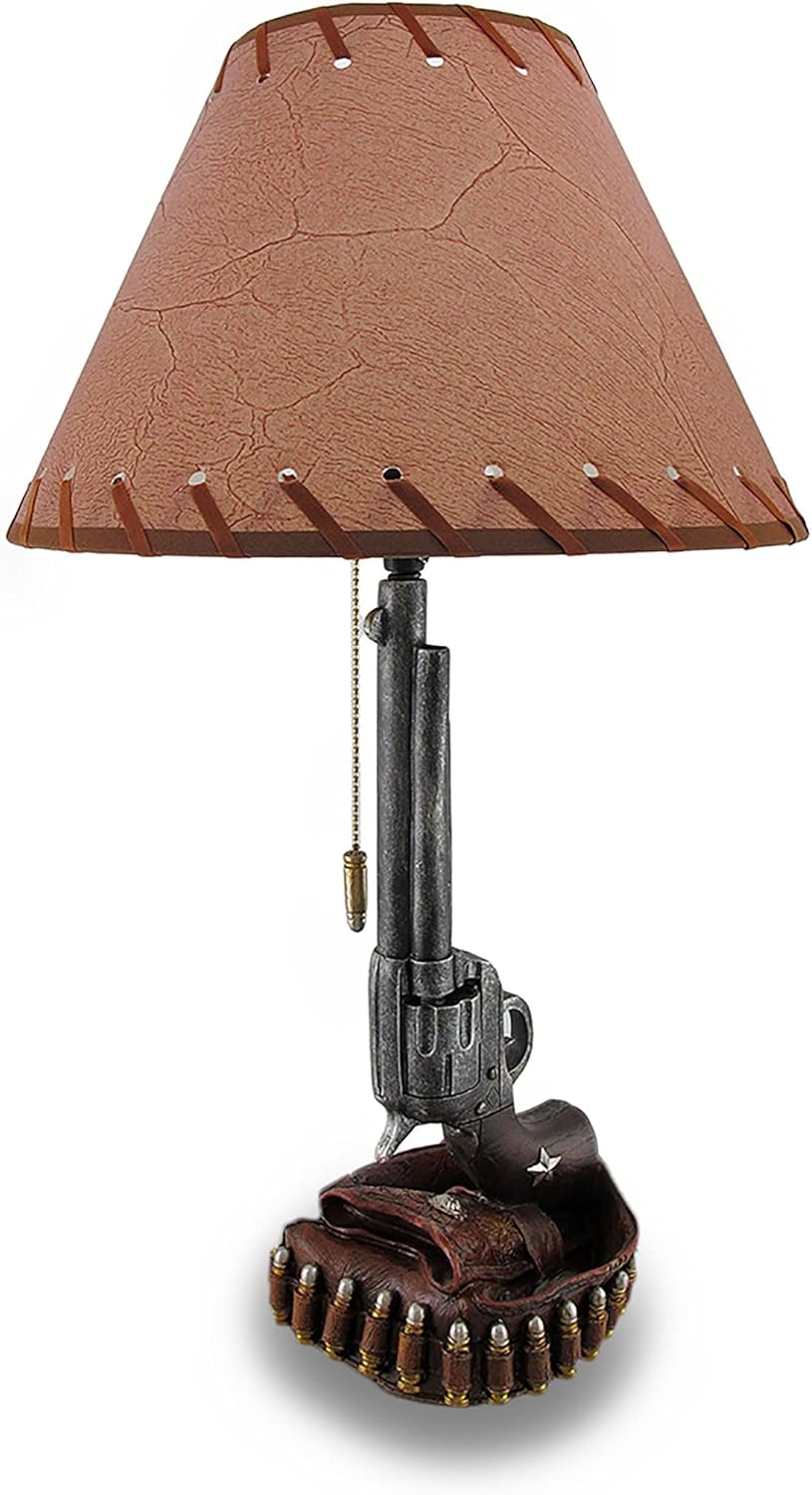 This awesome pair of Old West style table lamps is a perfect accent for a Western themed room. Each lamp features a long-barrel 6 shooter revolver with a bullet belt and holster at the base. Measuring 21 1/2 inches (55 cm) high, including the 8 inch high, 12 inch diameter shade, and 7 inches in diameter at the base, each lamp uses one standard size 100 watt max Type A, CFL or LED bulb which is not included, and has a pull chain with a bullet chain pull to easily turn it on or off. These lamps make a great gift for your special pardner.