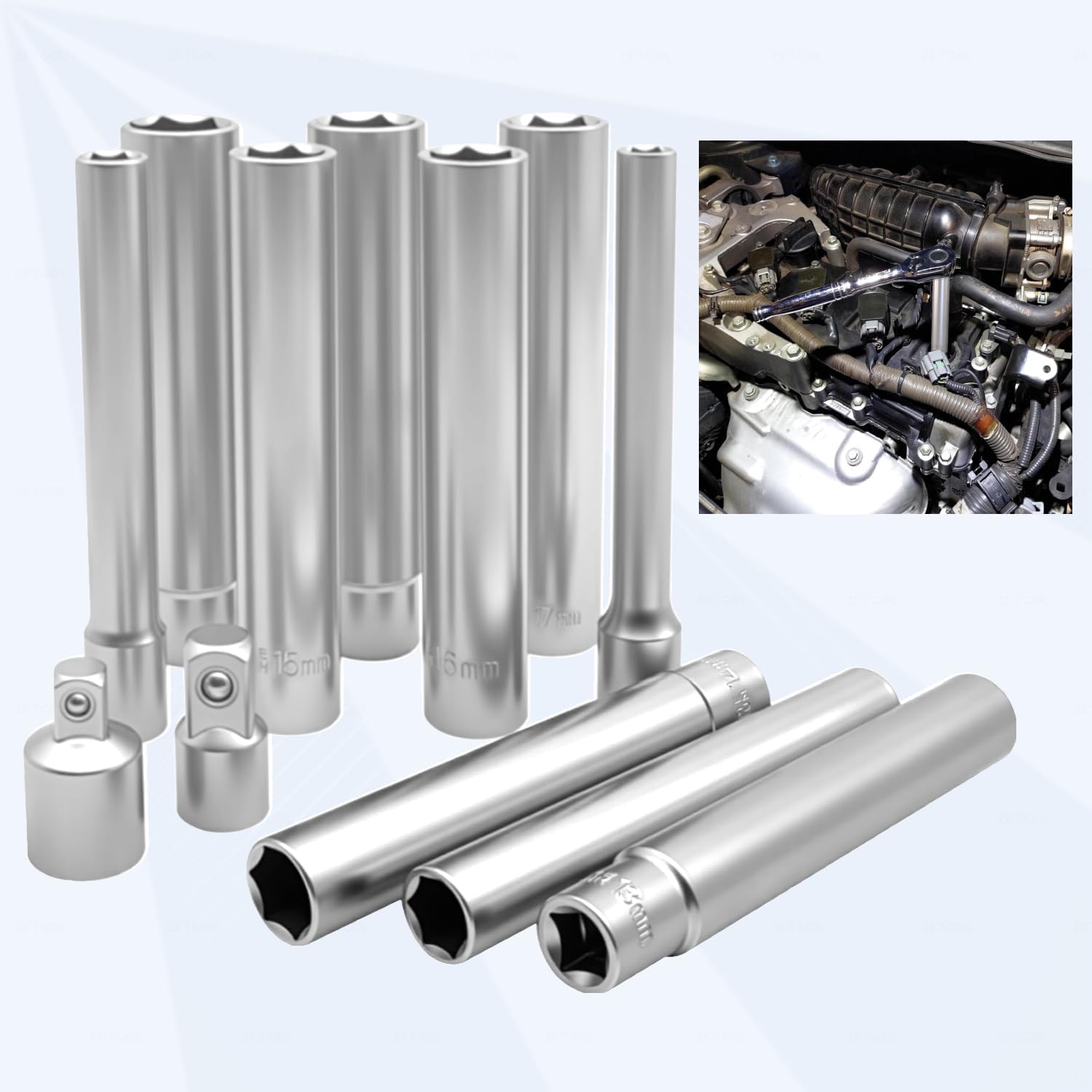 【SET INCLUDES】 12pc 3/8" Drive Extra Deep Metric Socket Set: 8mm,10mm,11mm,12mm,14mm(4.75” long); 1/2" Drive Extra Deep Metric Socket Set:15mm,16mm,17mm,18mm,19mm(4.75” long); With 1/2 3/8-Inch Adapter, it can adapt to more types of wrenches.