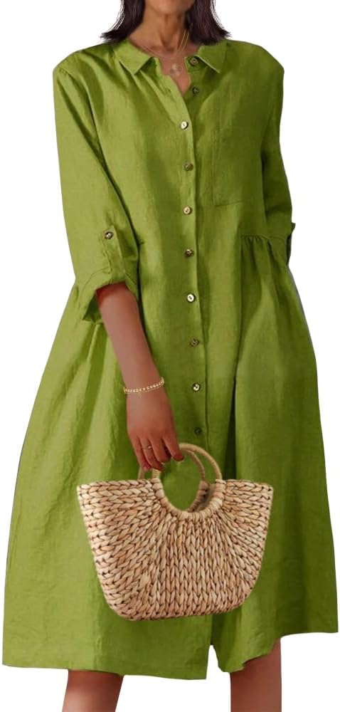 ZOCANIA Button Down Shirt Dress for Women Cotton Linen Midi Shirt Dresses 1/2 Sleeve Lapel Casual Tunic Tops with Pocket