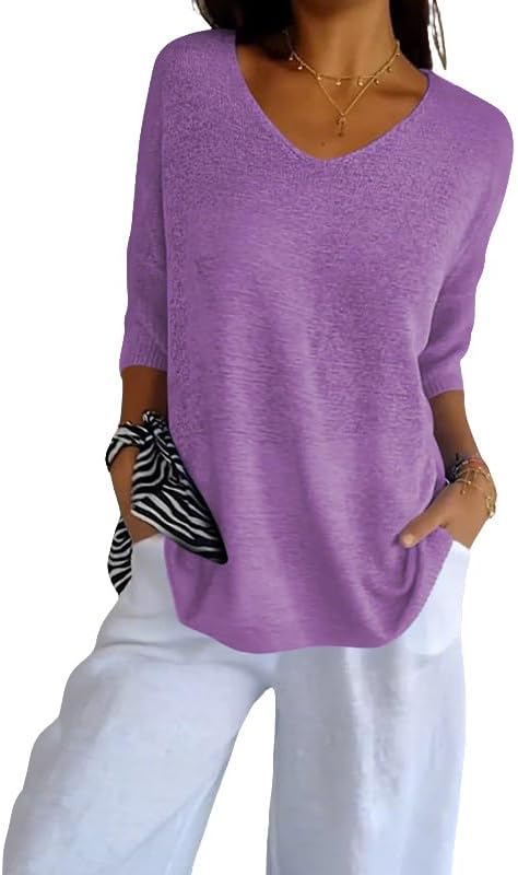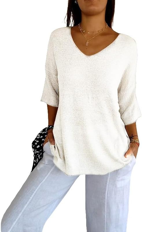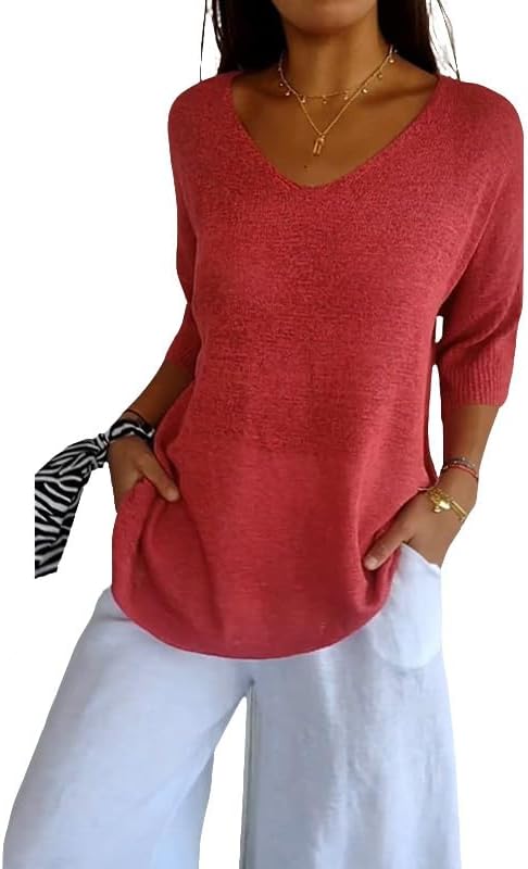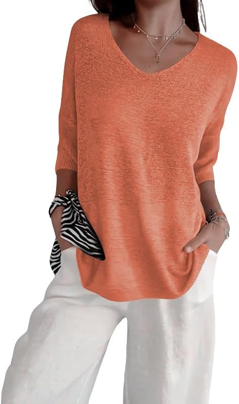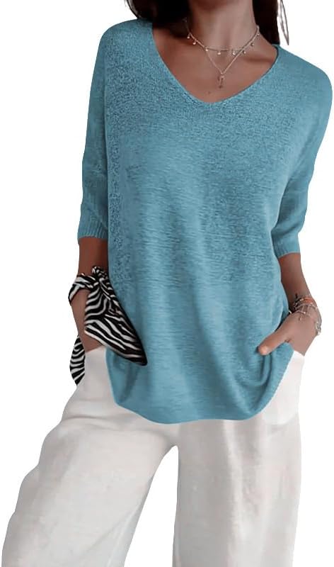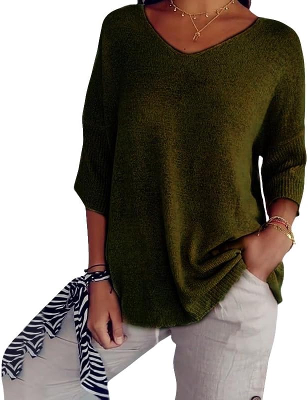 ZOCANIA Womens Sweater V Neck Knitted 3/4 Sleeve Sweaters for Women Oversized Lightweight Solid Color Pullover Casual Comfy Tops Basic Fall Trendy Clothes