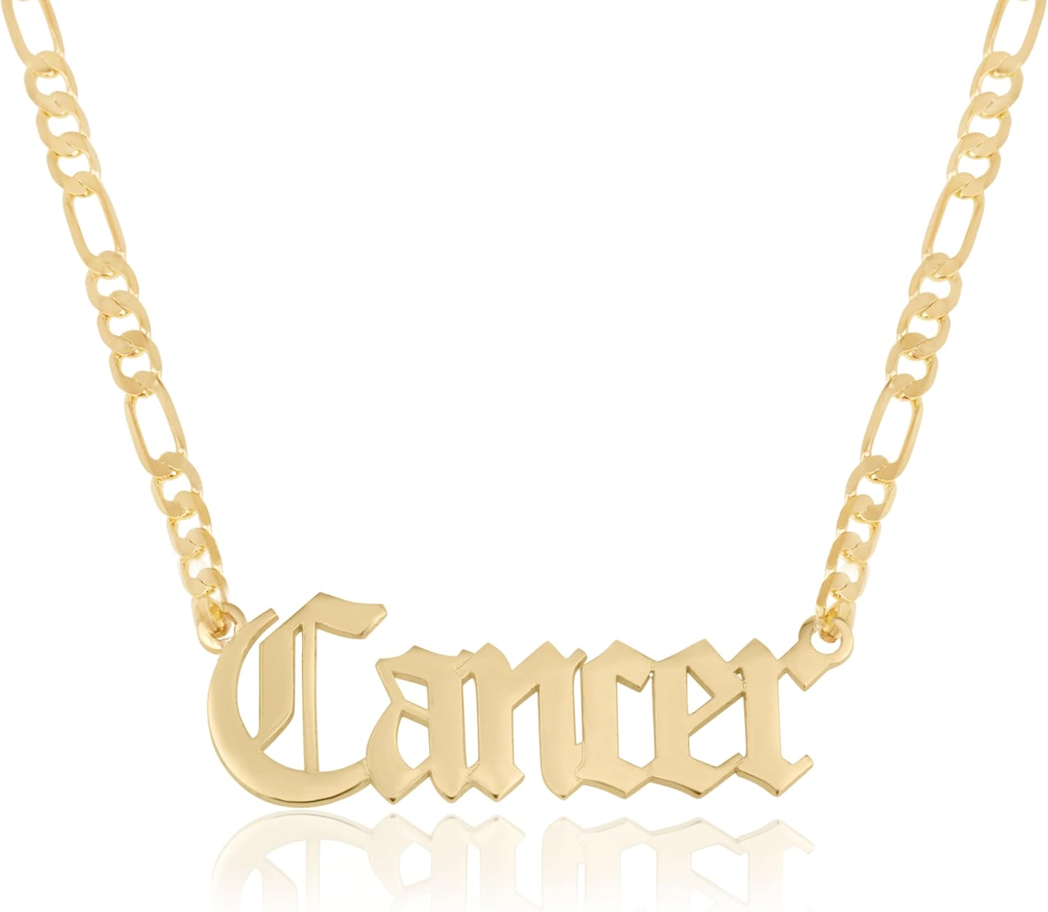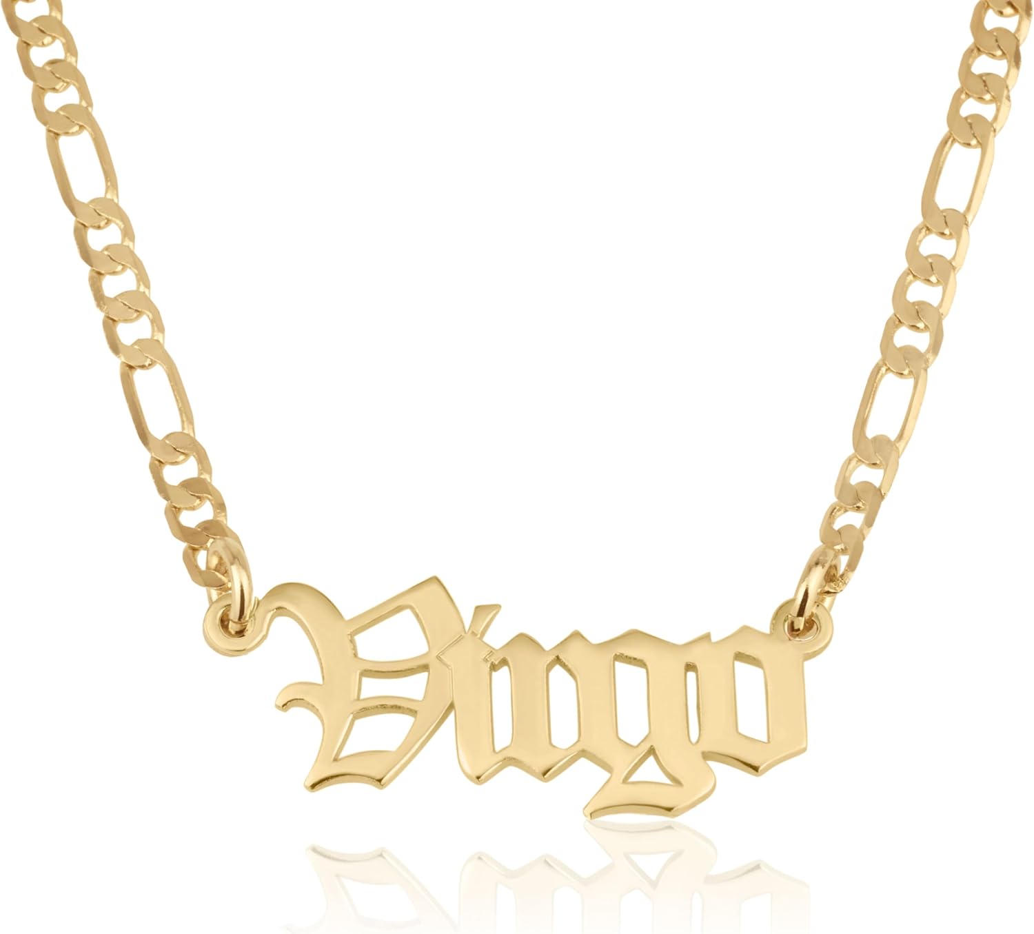 Let your sign lead with confidence. The Old English nameplate brings a bold, graphic edge, while the Figaro chain adds timeless texture. Whether you wear it solo or stacked, the look stays clean and intentional—simple to style, unmistakably you.