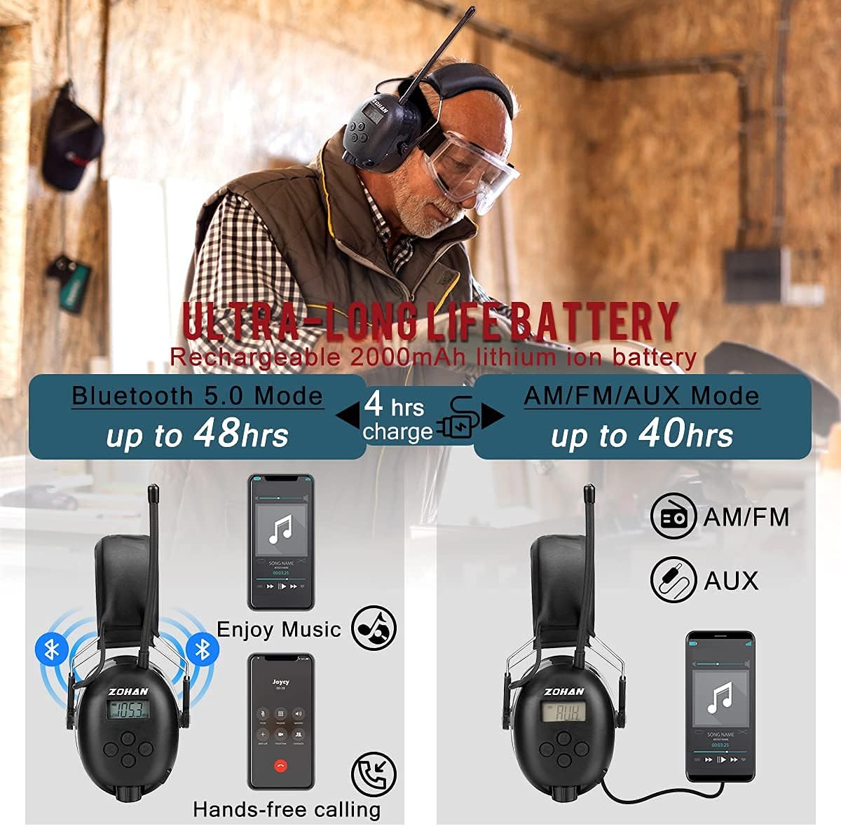 ZOHAN 033 Bluetooth 5.0 AM FM Radio Headphones, 25dB NRR Hearing Protection for Mowing Lawn&ZOHAN EM037 Hearing Protection with Bluetooth, NRR 25dB Noise Reduction Ear Protection,Headphones for Mowing Construction(033 Black + EM037 Green)