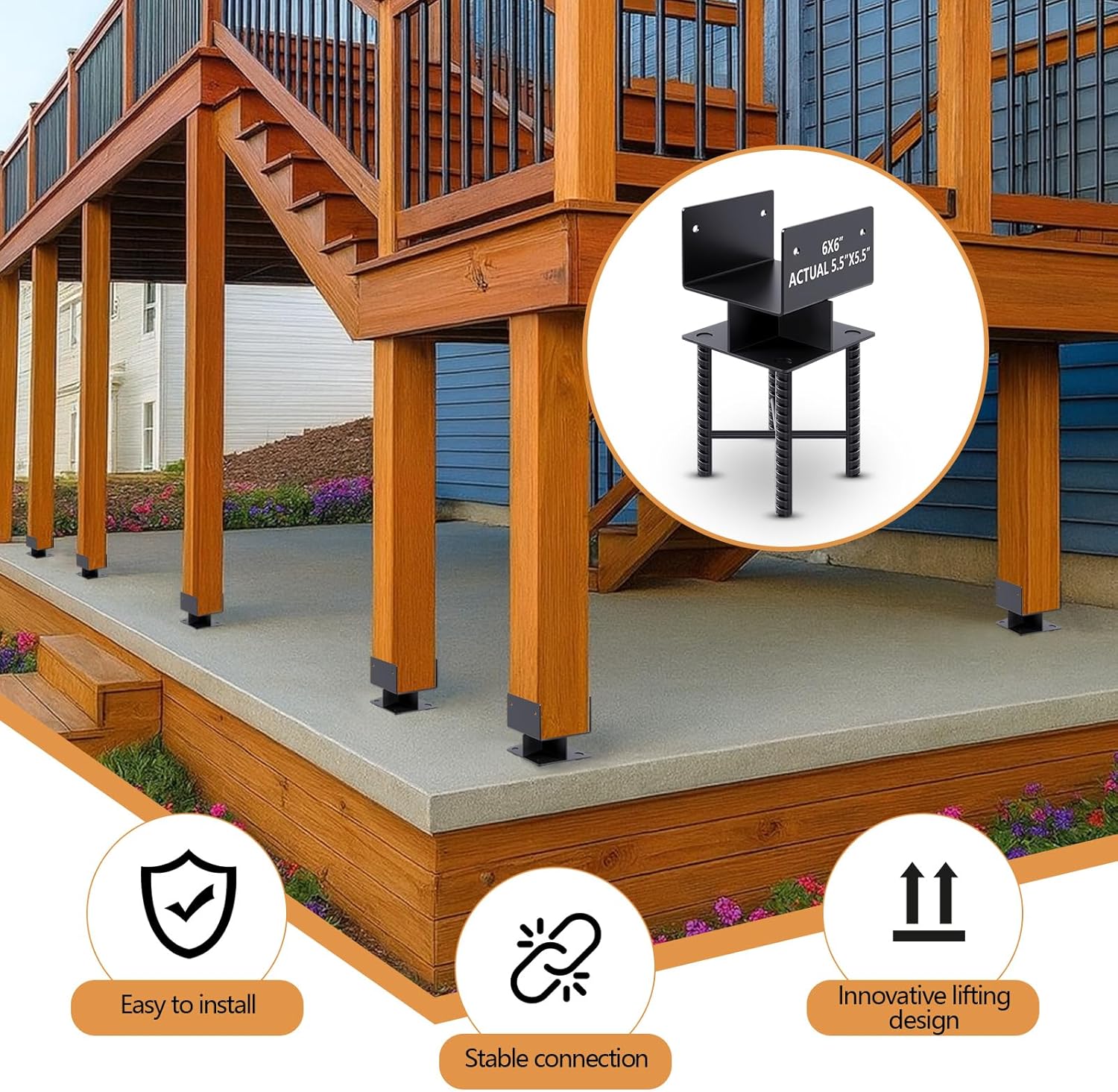 Features: All accessory screws are included and can be installed immediately. Firstly, before the wet concrete solidifies, insert the foundation anchor threaded steel portion into the wet concrete until it is parallel to the concrete. Then insert the casing into the wooden column and drill a hole with an electric drill Simply thread the screws through the wooden pillars and tighten the nuts to complete the installation The concrete post base adopts a cross steel plate cross welding pile design, which can separate the wooden columns from the damp ground and wooden columns, avoiding the risk of damage to the wood due to moisture, making the wooden columns more stable and safe, with a longer service life, and providing strong support for the connection between the wooden columns and the foundation Specifications: Material: steel Color: grey Size: concrete post bracket is suitable for standard 6" x 6" (actual 5.5" x 5.5"), wooden column 5.6" L x 5.6" W x 13" H (head height is 2.5", ground clearance depth is 6.5") Package includes: 2 Base brackets, 4 x sets screws, 8 x screw washers and 1 x drill sleeve Notes: Manual measurement, please allow slight errors on size. The color may exist a slight difference due to different screen displays. Small parts included, please keep them away from little people to avoid swallowing risk