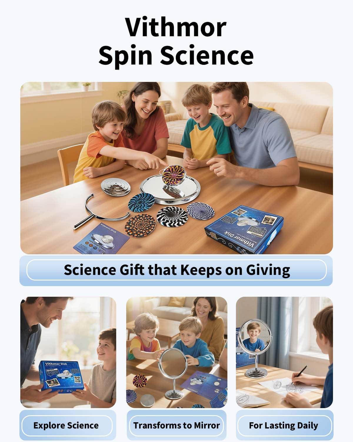 • 【2-in-1 Spin Science & Mirror】Not only a desk toy for physics, but also a practical magnifying makeup mirror for everyday use through transformation. Preventing from becoming forgotten fidget, it integrates kinetic energy motion into long-term daily! The product contains glass and is fragile; children need to play under adult supervision.