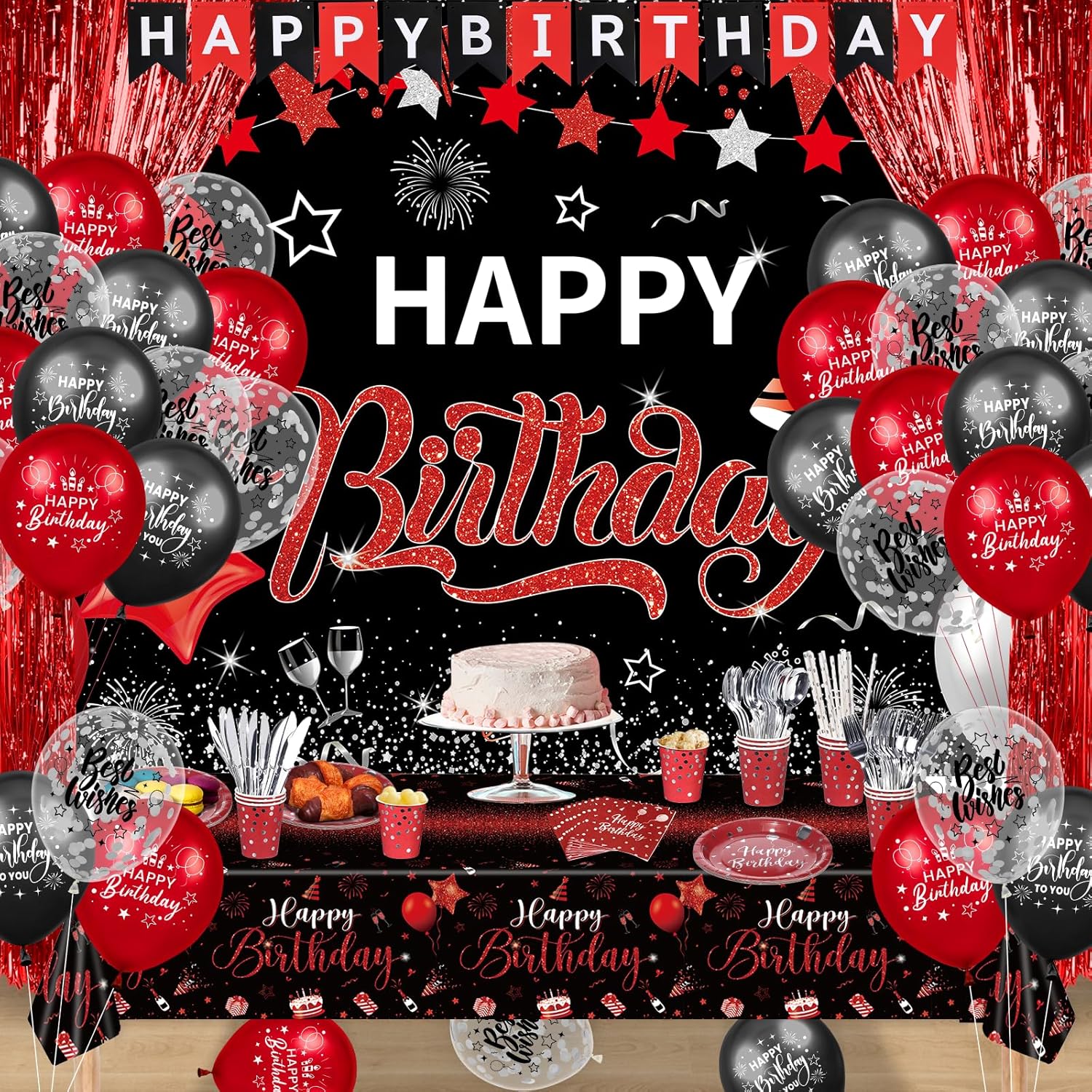 ❤️【131pcs 40th Birthday Decorations for Men Women】The package comes with 1 pc vibrant red and black happy 40th birthday banner, 1 pc tablecloth, 2 pcs shimmering foil curtains for that extra sparkle, 1 set eye-catching '40' foil balloon, 30 pcs red and black 40th birthday balloons, and 12 sets tableware (inclusive of plates, cups, napkins, straws, knives, forks, and spoons). Celebrate your 40th birthday with our 131 pcs red and black 40th birthday party supplies! 🖤【Exquisite Design】All these happy 40th birthday decorations are adorned with crisp, clear prints and celebratory messages that set the mood for a festive birthday atmosphere. The striking combination of red, black, and silver exudes sophistication and versatility. Whether for him or her, elevate the celebration with these red and black 40th birthday decorations. This all-inclusive set has everything you need to create a memorable birthday. ❤️【Easy to Assemble】No more party prep headaches! Our black red 40th birthday decorations are a breeze to install. The black red 40th birthday banner comes with convenient grommets in each corner for quick hanging. These 40th birthday balloons include ribbons for easy bundling and display, and there's plenty to create impressive balloon arches. You can enjoy a party to spend more time celebrating and less time setting up.🖤【Material】These 40th birthday party supplies for women men are reusable. The red and black happy 40th Birthday banner is made from polyester for easy care and store. The plastic tablecloth has a waterproof surface, while latex balloons are made of latex. Our sturdy tableware ensures enjoyable dining without worrying about breakage or leaks. ❤️【Wide Applications】Designed to fit a variety of spaces, from your living room to a dining room, our red and black happy 40th birthday decorations also make the outside full of atmosphere. These red 40th birthday decorations adorn garden fences, lawns, garage doors, and porches, etc. If you desire to host a birthday bash that stands out, our 40th birthday decorations kit will be a good choice.