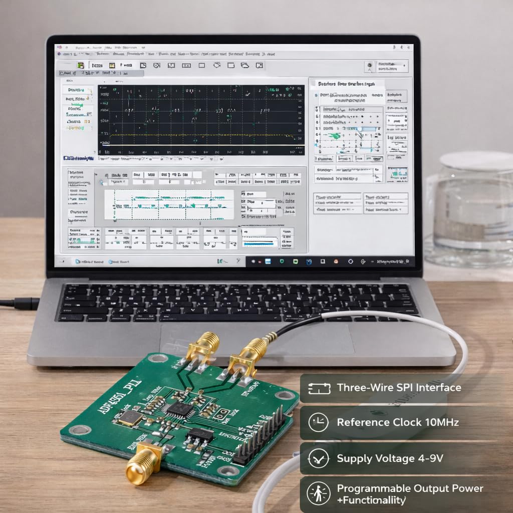 [WELL-DESIGNED CIRCUIT LAYOUT] This ADF4351 signal source development board features a meticulously designed circuit board layout, ensuring optimal performance and reliability. The thoughtful design minimizes signal interference and maximizes efficiency, making it a top choice for professionals and hobbyists alike.[UPPER COMPUTER CONTROL] The board can be seamlessly controlled using the official upper computer software, providing a user-friendly interface for managing all functions. This feature allows for easy configuration and monitoring, enhancing the overall user experience.[CONVENIENT CONTROL PINS] All control pins are conveniently ed out, enabling straightforward and hassle- operation. This design ensures that users can easily access and manipulate the board’s functions, making it ideal for both beginners and experienced users.[PRECISE CRYSTAL OSCILLATOR] Equipped with a default +-50ppm 25M active crystal oscillator, this board delivers exceptional frequency stability and accuracy. This precision is crucial for applications requiring reliable and consistent signal generation.[VERSATILE FUNCTIONALITY] The three-wire serial peripheral interface bus s to control pin and state locking pin, enabling a wide range of functions including point frequency sweep and frequency hopping. This versatility makes the board suitable for various advanced applications in wireless communication and electronics.Spec:Features:This ADF4351 signal source development board has well designed circuit board layout.It can be controlled by the upper computer official software.All control pins are ed out for convenient operation.Default + ‑50ppm 25M active crystal oscillator.Three‑wire serial peripheral interface bus to control pin and state locking pin, allowing all functions including point frequency sweep and frequency hopping.Specifications:Output frequency range: 35MHz ‑ 4.4GHz Supply voltage: