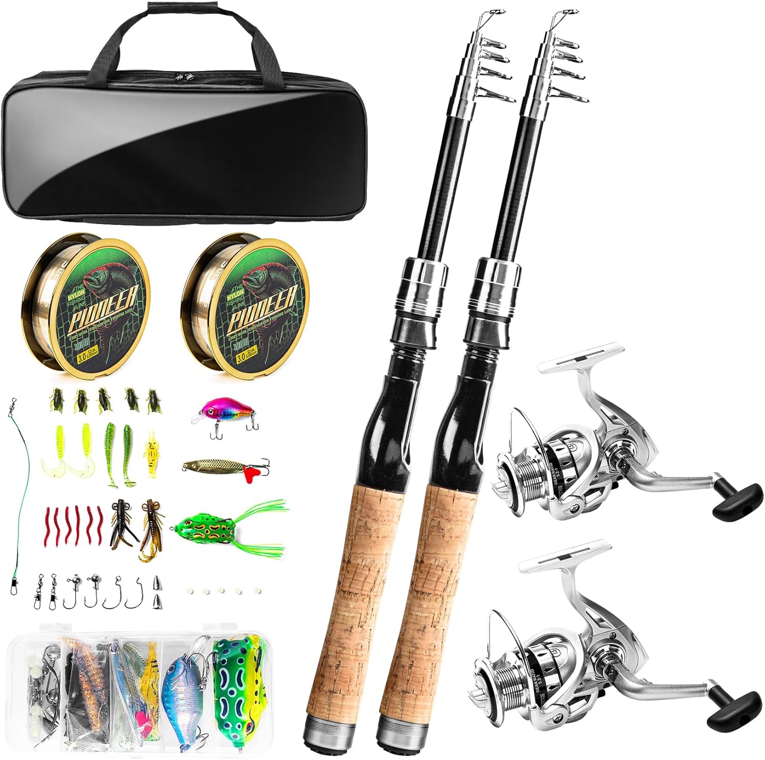 • ALL-IN-ONE Fishing Kits: 2 Fishing Rods + 2 Fishing Reels + 2 Fishing Lines + Various Fishing Lures + Fishing Hooks + 1 Fish Lip Gripper + 1 Carrier Bag. This all-in-one fishing combo included everything you need for a great fishing experience