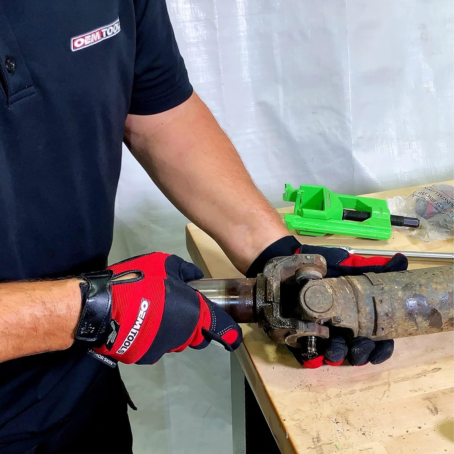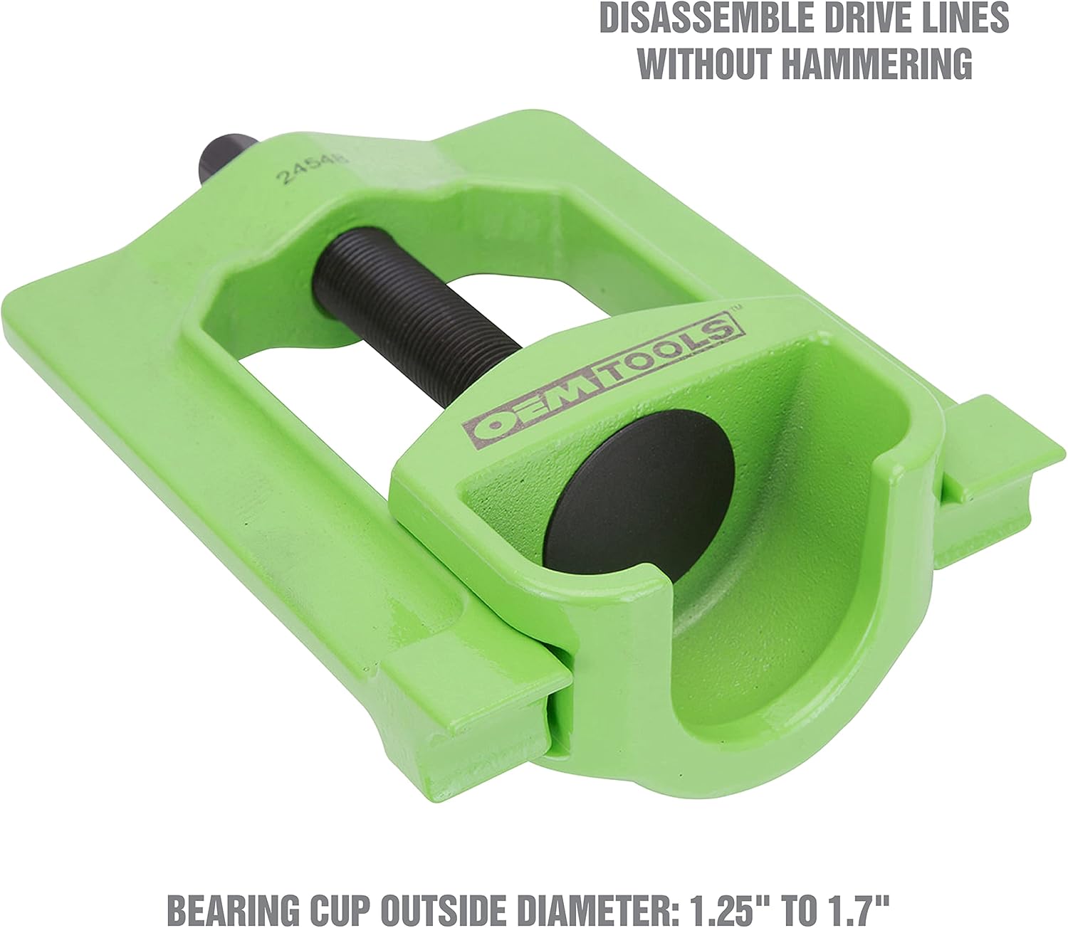 Remove u joints easily with the OEMTOOLS 24548 Intermediate U Joint Puller. This u-joint tool is a safe, cost-effective, and easy-to-work option for avoiding other high-cost tools or an expensive visit to the mechanic. Seized bearing cups don’t stand a chance when met with this u joint removal tool. The u joint puller is designed for most intermediate trucks, buses, and light industrial/farm equipment, saving you time and leaving no need to rely on harsh methods such as hammering or heating. The u joint puller won’t damage the driveshaft, yokes, joints, or bearing cups like improvised methods can. Yokes effortlessly fit into the 1.25 to 1.7 inch outside diameter bearing cup. Simply torque the forcing fastener on the heavy duty u joint puller with a 1 inch drive impact wrench or smaller. Save yourself time and energy with the OEMTOOLS 24548 Intermediate U Joint Puller.