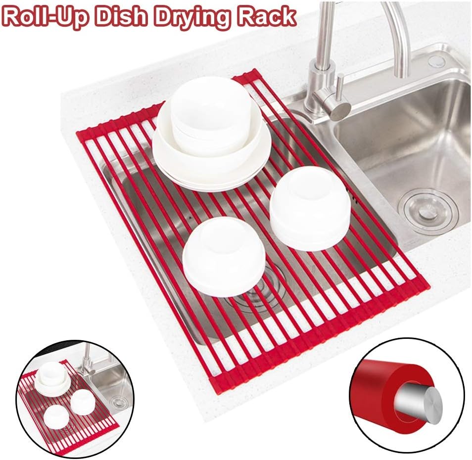 It can air-drying any washed tableware, cookware, bakeware, stoneware, flatware, kitchenware and fragile glassware,which looks great.PRODUCT SPECIFICATIONS: Size:52*33cm/20.5*13inchMaterial:Food grade SUS304 Stainless Steel, siliconeTube quantity: 18 pipes Heat Resistance: 460°F (240°C)Color: Black , Gray , RedWeight: 1kgLoad weight: 33 lbsCleaning method:clean it in hot water,or run it through the dishwasherApplicable place:roll up drying-- For holding heavy pots, fry pans, China, ceramic, porcelain-- For cooking prep works: holding cutting board, filling liquid containers (coffee cup, babies milk, etc.) or powders, pancake or cake mix, etc. makes mess right into the sink.-- For holding wet vegetable and fruits temporary like a salad colander or vegetable washing bowl. -- For holding bread, cake to dry like a cooling rack much quicker. For holding hot pots & pans, or putting frozen items to thaw, etc. -- Frees up more counter space-- Rolls up quickly and neatly into a compact cylinder to save space, stores horizontally or vertically -- Also perfect for camping, picnic, and other outdoor activities.Note:-- To avoid buying products with incorrect dimensions, please measure the kitchen sink before placing an order.-- About the product: We measure manually, the size can be an error of 1-3 cm, 【1(in) = 2.54cm】which is a problem qualité.Endue to different camera angles, there will be some color difference due to various factors, please refer to the actual product.